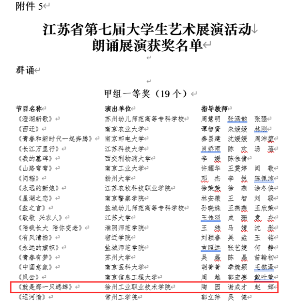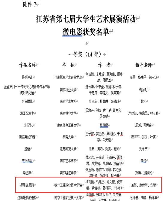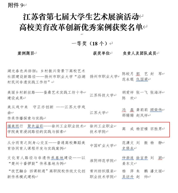江苏省大学生艺术展演由省教育厅主办,每三年举办一次,面向全省所有高校,是目前我省规格最高、规模最大、影响最广的大学生艺术盛会,是集中展示高校美育成果的重要活动。本届艺术展演以“厚植家国情怀,涵养进取品格”为主题,分为艺术表演类、艺术作品类(含学生艺术作品和高校校长书画摄影作品)、大学生艺术实践工作坊、高校美育改革创新优秀案例四大类。本届展演活动共评出省级艺术表演类特等奖92个、一等奖133个、二等奖173个、三等奖200个、优秀创作奖136个;艺术作品类特等奖13件、一等奖183件、二等奖198件、三等奖631件、校长风采奖64件;大学生艺术实践工作坊特等奖9个、一等奖14个、二等奖31个、三等奖33个;微电影特等奖6部、一等奖14部、二等奖30部、三等奖50部;高校美育改革创新优秀案例特等奖18篇、一等奖18篇、二等奖24篇、三等奖35篇;获得特、一、二等奖表演类节目、艺术作品、微电影和艺术实践工作坊的指导教师获指导教师奖。同时,评出江苏省第七届大学生艺术展演活动优秀组织奖51个,优秀大学生艺术团20个,优秀大学生艺术团团员111个,优秀美育管理工作者50名。