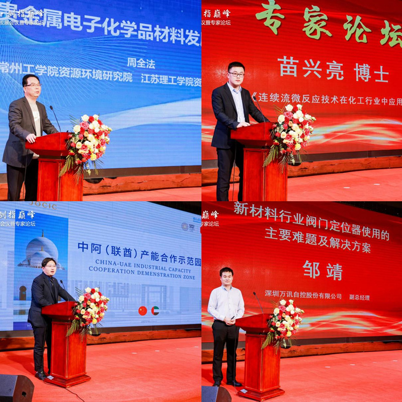 论坛期间,常州工学院周全法院士、康宁反应器技术有限公司高级应用工程师苗兴亮、江苏省海外合作投资有限公司招商总监、中阿产能合作(江苏)开发管理有限公司副总经理缪菲、深圳万讯自控股份有限公司董事邹靖等专家分别围绕《贵金属电子化学品材料的发展及应用》《连续流微反应技术在化工行业中应用》《中阿产能合作示范园推荐》《新材料行业阀门定位器国产化替代主要难点及解决方案》作主题演讲。
