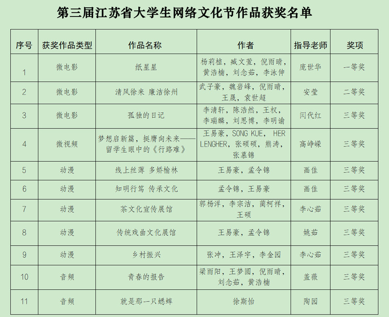 江苏省大学生网络文化节作品推选展示活动由省教育厅主办,每两年举办一次,面向全省所有高校,是目前我省规格最高、规模最大、影响最广的大学生网络作品集会,是集中展示高校网络文化育人成果的重要活动。根据《省委教育工委省教育厅关于组织开展第三届江苏省大学生网络文化节和高校网络教育优秀作品推选展示活动的通知》(苏委教函〔2022〕11 号)文件精神,校团委在全校范围内组织开展了大学生网络文化节作品和教师网络教育作品推选展示活动,坚持公平公正、透明公开、好中选优的原则,按照作品主题、作品内容、作品设计、作品规范、育人效果等要素,经个人申报、材料初审、专家评审和拟获奖作品内容审核、公示,共遴选出11件优秀作品进行反复修改打磨并参与省级评选,作品类别包含了摄影、微电影、动漫、校园歌曲、新媒体作品等多个类别。