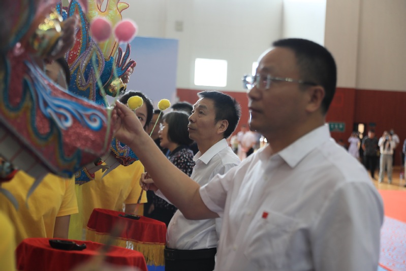 在运动员代表丁顺、裁判员代表冯韬庄严宣誓后,体育馆的上空又回荡起《龙凤呈祥》的欢快音乐,主席台上的领导和嘉宾庄重地为参赛祥龙点睛,13条彩龙顿时灵气聚发,威风凛凛。