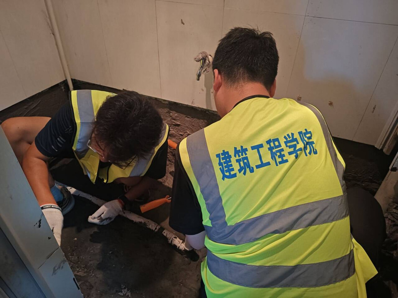 深入群众基层,开展实地调研。为切实掌握小区的实际情况,查找存在问题,7月5日上午,实践团走进振兴工程小区,通过实地考察、深度访谈、问卷调查的方式充分了解居民的需求和问题。据调研结果显示,共有2栋楼屋面渗漏、5处外墙渗水、15%卫生间渗水。卫生间作为家庭中使用水最多的区域之一,其防水工作直接关系到家庭成员的安全和健康,因此,实践团选择一家“五保户”进行卫生间防水施工。