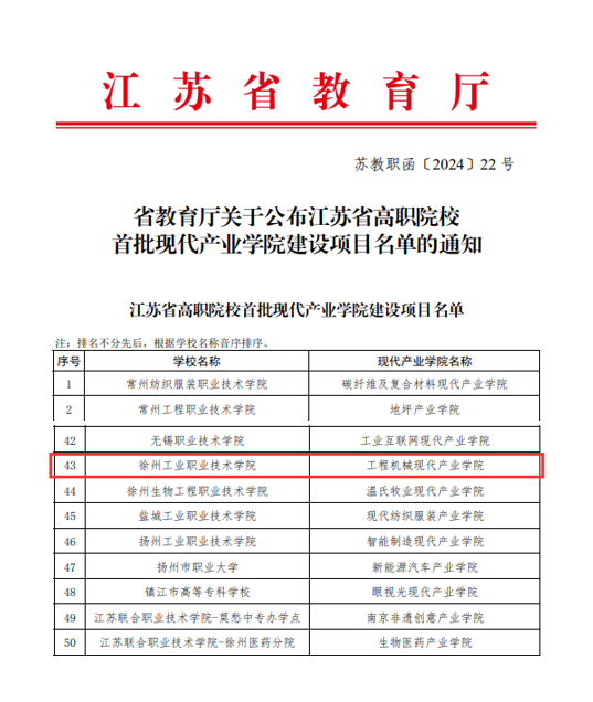 日前,江苏省教育厅正式发文《省教育厅关于公布江苏省高职院校首批现代产业捕鱼达人破解版 建设项目名单的通知》(苏教职函〔2024〕22号),捕鱼达人破解版 牵头申报的“工程机械现代产业捕鱼达人破解版 ”成功获批立项。