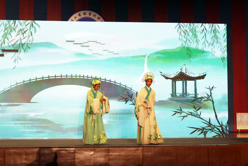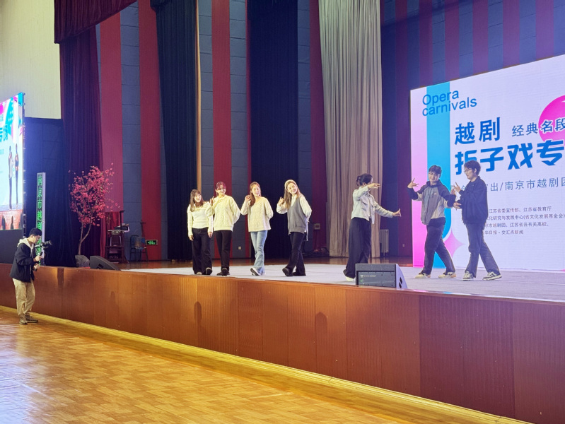 演出正式开始前,青年演员赵景星、李思逸为现场观众带来戏曲导赏,并邀请大学生与南京市越剧团的优秀青年演员互动,青年学子登台学习了越剧表演中经典的手势、步法和身段,通过动作的模仿感受着传统戏曲的魅力。