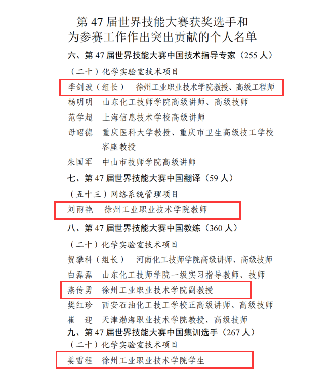 第47届世界技能大赛获奖选手和为参赛工作作出突出贡献的个人部分名单