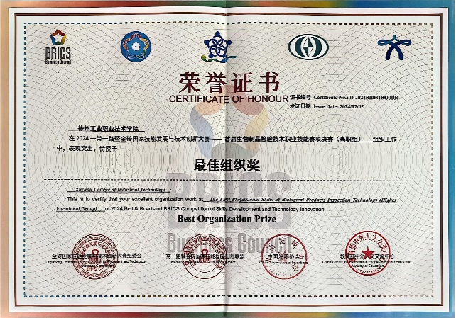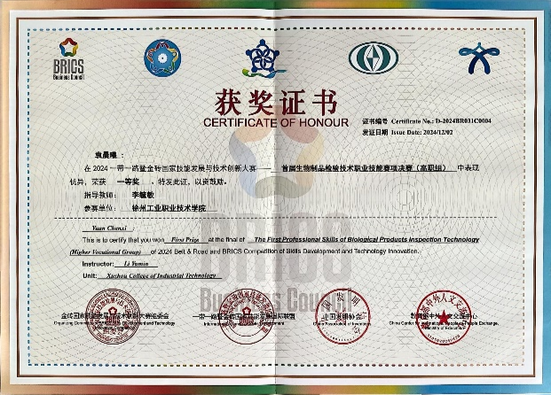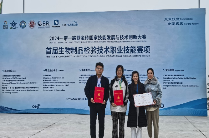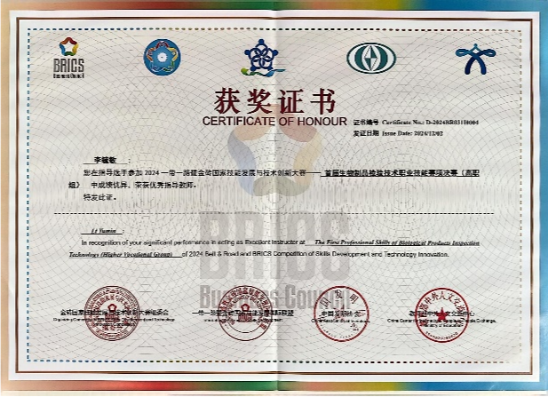 2024年“一带一路暨金砖国家技能发展与技术创新大赛”首届生物制品检验技术职业技能赛项总决赛于2024年11月29日—12月2日在重庆工贸捕鱼达人破解版 举办,化学工程捕鱼达人破解版 李毓敏、吴昊老师指导的药品生物技术专业2022级学生袁晨曦历经4天的激烈角逐,凭借着扎实的专业知识、精湛的实操技能、过硬的心理素质,在全国77所高职院校中脱颖而出,荣获一等奖(金奖),指导教师李毓敏荣获优秀指导教师荣誉,捕鱼达人破解版 被授予全国总决赛最佳组织奖。