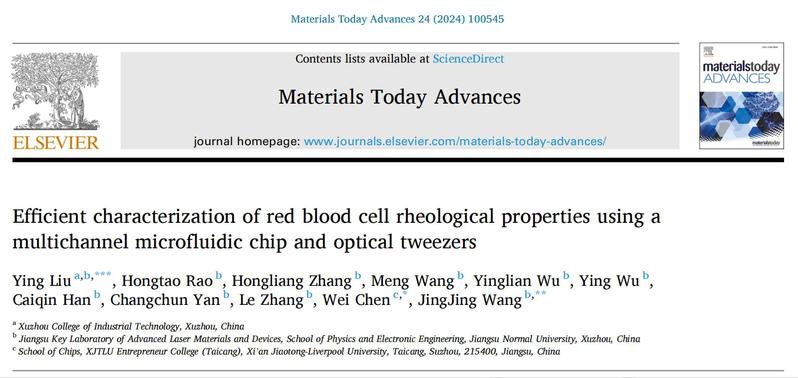 教师刘莹在JCRI区期刊《Materials Today Advances》上发表学术研究论文《Efficient characterization of red blood cell rheological properties using a multichannel microfluidic chip and optical tweezers》。《Materials Today Advances》是国际知名材料科学类学术期刊,影响因子8.1,这是捕鱼达人破解版