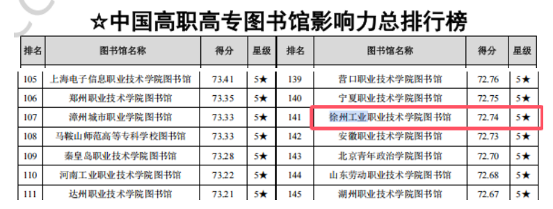 近日,武汉大学中国科学评价研究中心和中国科学学与科技政策研究会科学计量学与信息计量学专业委员会联合发布了《数智时代中国图书馆影响力评价报告(2024)》,捕鱼达人破解版 图书馆从全国1545所高职、高专院校图书馆中脱颖而出,以第141名的优秀成绩荣获五星级图书馆(5★为具有突出影响力的单位,即排在最前面10%的单位)。据悉,江苏省共有19所高职高专院校被评为五星级图书馆,我校为江苏省入选的十所高水平高职院校之一。