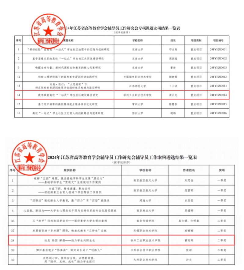本次课题申报和案例征集评选由江苏省高等教育学会辅导员工作研究委员会主办,活动旨在深入实施“时代新人铸魂工程”,不断加强辅导员队伍专业化建设。据悉,2024年江苏省高校辅导员工作专项课题、工作案例征集活动共收到专项课题251项、辅导员工作案例203篇,最终设立专项课题重点项目25项、一般项目50项、指导项目101项,遴选出辅导员工作案例一等奖20篇、二等奖41篇项、三等奖61篇。