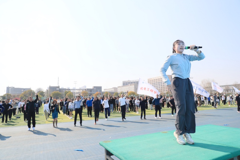 启动仪式后,校领导率先垂范,与千名师生共跳健身操。在张雨馨老师的带领下,党委书记刘莹、校长鲍桂楠等领导走上操场中央,随着《燃烧我的卡路里》旋律舒展身姿。他们挥臂、踏步、转身,动作刚劲有力,与师生方阵形成互动。矫健身影与蓝天白云交相辉映,化作一片跃动的海洋。领导们的投入点燃全场热情,“没想到校领导跳得这么专业!”现场学生感慨。半小时的健身操不仅释放压力,更以“身体力行”诠释了“运动融入日常”的理念。