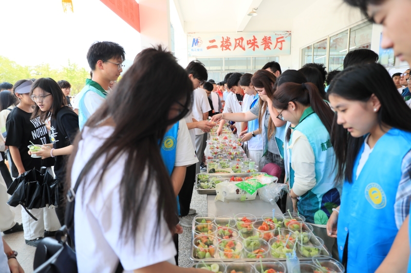 活动当日,各学院依据作物成熟度分区域有序采收。完成食材预处理后,同学们在后勤老师的指导下,分组开展菜品制作。黄瓜被切成薄片精心摆盘,甜瓜去籽后切成均匀小块,西红柿与紫苏叶巧妙搭配成创意拼盘,还有虎皮辣椒、狼牙土豆、蒜汁茄子、玉米面窝窝头等一道道美食。二食堂门前的“丰收展台”上,这些凝聚着师生心血的美食香气四溢,吸引了众多师生驻足品尝。