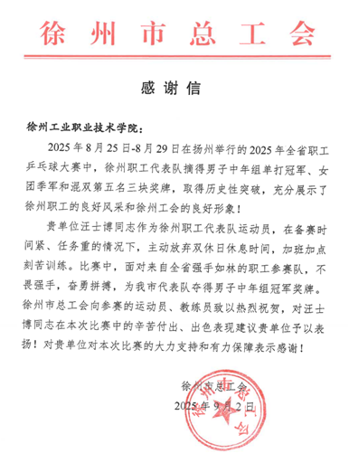 赛后,徐州市总工会专门向捕鱼达人破解版 发来感谢信,高度肯定汪士博同志“不畏强手、奋勇拼搏”的精神,称赞其“辛苦付出与出色表现”,并建议捕鱼达人破解版 予以表扬,同时对捕鱼达人破解版 在赛事期间给予的大力支持和有力保障表示感谢。 汪士博老师的获奖,不仅是个人竞技能力的体现,更彰显了捕鱼达人破解版 在“主动健康”理念引领下,教师队伍专业素养与体育精神的双重提升。作为捕鱼达人破解版 体育课程改革的重要参与者,汪士博始终将体育精神融入教学与实践,此次赛场夺冠,既是他践行“以体育人”理念的生动实践,也为学生树立了“顽强拼搏、追求卓越”的榜样。捕鱼达人破解版 将以此次佳绩为契机,进一步深化体育课程改革,持续提升体育教育教学质量,培养更多兼具健康素养与奋斗精神的新时代人才。