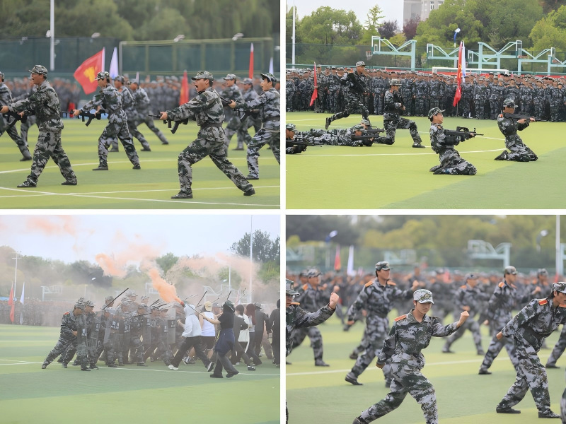 军体拳方队动作刚劲有力,虎虎生风,展现了力与美的结合;刺杀操方队气势如虹,刺杀动作干净利落,喊杀声震天动地;战术演示方队配合默契,战术动作娴熟,场面逼真震撼;防暴演练环节,队员们处置果断,队形变换有序,体现了应对突发情况的训练成果。活字印刷方阵通过变换展示和平鸽、“1945-2025”“80”及校训等图案文字,致敬抗战胜利80周年,彰显爱国爱校情怀。