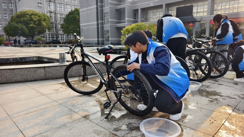 与此同时,校园喷泉广场的单车维护服务同步开展。志愿者们手持清洁工具与维修配件,认真擦拭单车车身、清洁润滑链条、精准调试刹车与变速系统,高效解决车辆积灰、卡顿、制动不灵等常见问题,让校园单车焕然一新,为师生日常出行提供便利。在劳动中,同学们既巩固了专业技能,也在服务他人中收获了成长与快乐。