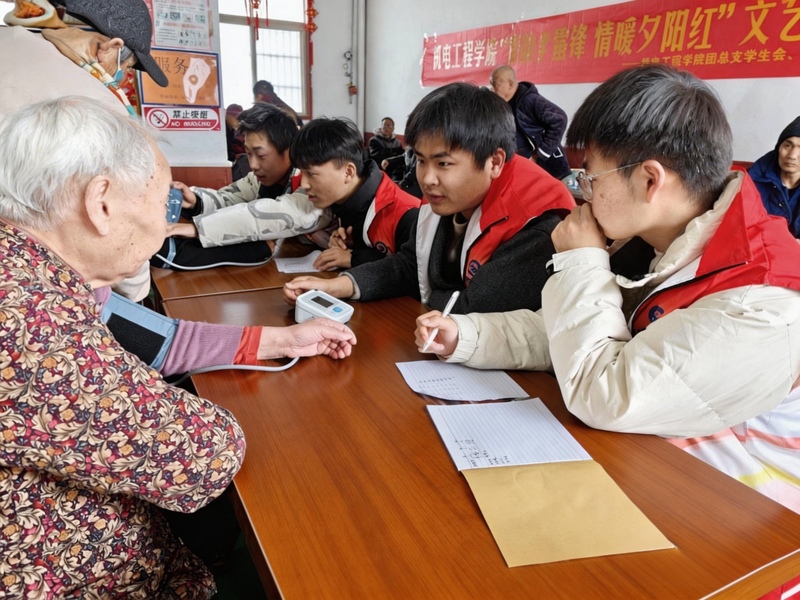 除了精神上的慰藉,志愿者们在服务上更是细致入微。考虑到春季气温多变,是心脑血管疾病的高发期,志愿者们自带血压计,在现场支起了“健康服务台”。他们耐心地为敬老院70余位老人测量血压,仔细记录数据,并将测量结果汇编成册反馈给敬老院的工作人员,以便进行后续的健康观察。在活动的另一边,更多的志愿者三五成群,围坐在老人们身边跟他们唠家常。同学们有的听老人讲述年轻时的故事,有的向老人汇报自己的学习生活,大家像对待自家爷爷奶奶一样,用最质朴的陪伴温暖着老人们的心房。